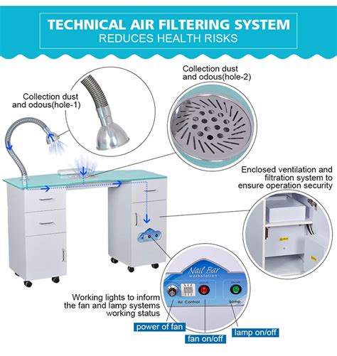 Furthermore, these tables are designed with the utmost convenience in mind. Equipped with built-in ventilation systems, they eliminate the need for bulky standalone fans or ventilation units that can take up valuable space in a salon. The exhaust fan is strategically placed within the table, ensuring efficient air extraction without interfering with the work surface. Additionally, many manicure tables with exhaust fans come with integrated storage compartments and adjustable lighting, offering additional functionality and organization for nail technicians.
